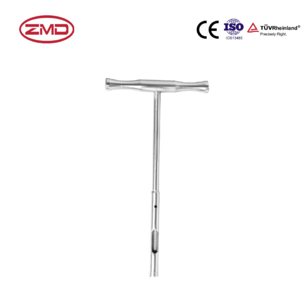 It is a T – shaped hollow saw that encircles and cuts broken implants (nails, screws) in bone, enabling safe removal during revision surgeries. It combines precision, torque, and safety for minimally invasive extraction.