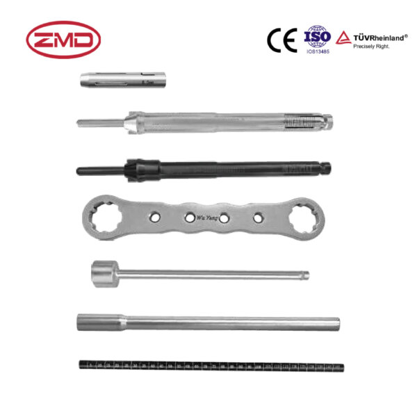 A specialized tool for ankle surgery, featuring a rod compressor (65mm) and cartilage impactor (215mm). It assists in implanting rods, impacting cartilage grafts, and restoring ankle structure.