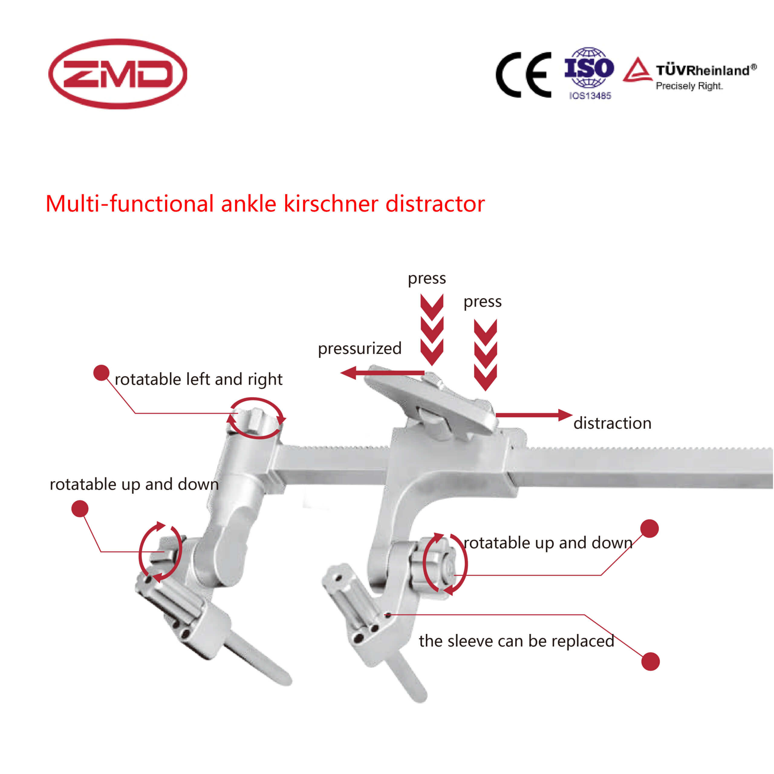 A specialized orthopedic instrument for ankle surgeries, this distractor utilizes Kirschner wires to stabilize and distract ankle structures. Featuring multi – directional rotation, interchangeable sleeves, and versatile operational functions, it creates optimal surgical access for procedures such as fracture repair and joint reconstruction.