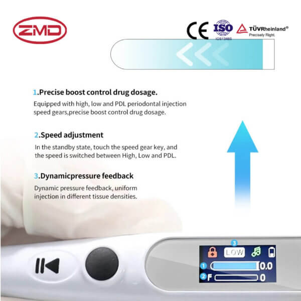 Dental Anesthesia Injector is an advanced electric medical device designed for dental procedures. It enables precise, painless local anesthesia delivery through intelligent control of dosage, pressure, and injection speed. With features like real-time pressure feedback, multi-mode adaptation, and ergonomic design, it makes dental anesthesia safer, more comfortable, and efficient for both dentists and patients.